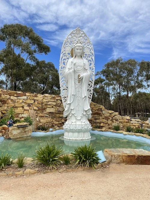 The Peace Park showcases symbols from many faiths including Catholic, Sikh, Islam, Hindu and Buddhism and the gardens contain iconic statues and illustrations of the Buddha’s teachings. A notable one is the statue of Quan Yin, who represents the compassionate aspect of the Buddha. This 7m statue was sculpted in Vietnam in poly-marble and hand painted at the stupa in Bendigo. Another is the representation of wonderful story of The Four Harmonious Friends that illustrates the benefits of working together and living in harmony.