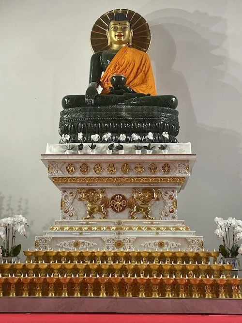 The building is progressing slowly as funds become available but although there is clearly much work still to do, the building, surrounding gardens and the Gompa (temple) inside the stupa are breathtaking. The gompa contains huge statues of Buddhas and deities, some complete and others in the process of being constructed or decorated, the most notable being The Jade Buddha for Universal Peace. This is the largest Buddha carved from gemstone quality jade in the world. The Buddha has been carved from a rare boulder of translucent jade which was discovered in Canada in the year 2000. At 2.5 metres high and weighing four tonnes, it sits on an alabaster throne of close to 1.6 metres high and is considered to be priceless.